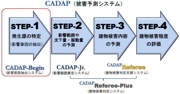 建設工事による建物被害の予測や因果関係判定を行うCADAP(被害予測システム)は以下のような4つのステップにより構成されています。(CADAPのパンフレットはこちら) このうち、CADAP-Begin(影響要因抽出システム)は、STEP-1の「建物被害の発生源」を特定する部分(赤囲いの部分)のシステムです。 振動被害は重機や作業内容からCADAP-Jr等により比較的容易に発生源を特定する事が可能ですが、沈下被害の発生源となる沈下要因(影響要因)は様々で多岐に亘り複雑になります。 影響検討に際しては沈下要因(影響要因)に応じた適切な解析手法の採用がカギとなるため、沈下要因(影響要因)の特定が大きなポイントになります。 CADAP-Begin(影響要因抽出システム)は工事内容や地盤条件から影響要因を特定するシステムです。 |