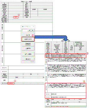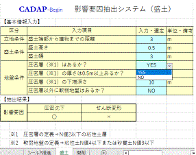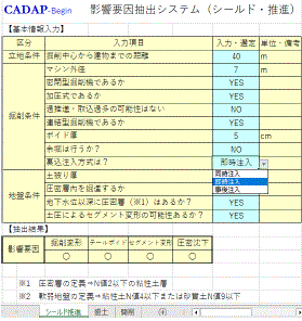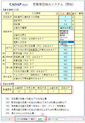 工事工法(開削工事・シールド推進工事・盛土工事)別に用意されたシートから指定された入力項目についてリスト選択または値入力する事で瞬時に影響要因が抽出されます。 |
