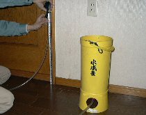 ”不同沈下”は、建物内の最も高い点を基準(±0)に、各点の高さの差(高低差)を出すものです。(最も高い点を基準にすれば全てマイナスになります)但し、体育館のように間仕切りもなく、床に段差がなければ簡単ですが、既存住宅では見通しが利かず、各部屋の床には段差があるので、ここが測定のポイントとなります。このため、見通しの利かない既存住宅では、水盛管が便利なのです。水盛缶に10mのホースを取り付ければ、通常の住宅であれば一連の測定で結果が得られます。