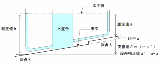 床に段差がある場合は、図-2のように段差分を補正し、フラットな床面を想定して高低差を算出する必要があります。段差Δは敷居などの厚みをスケールで直接測定するか、水盛管を用いて段差の前後の測定結果から「段差Δ」を測定します。水盛管や水管の場合、水位が適切な高さとなるように器具を設置し、適正な姿勢で測定する事が重要で、水位の測定は図-1右上○内に示すように、同一水面を統一して測定する必要があります。ホース内に気泡が残ると測定誤差が生じますので、設置に際しては良く点検する必要があります。
