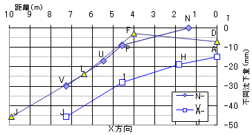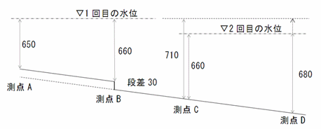 沈下測定の原理は、図-1のように仮想水平線から各測点までの距離を測定して、床面の沈下状況を測定します。