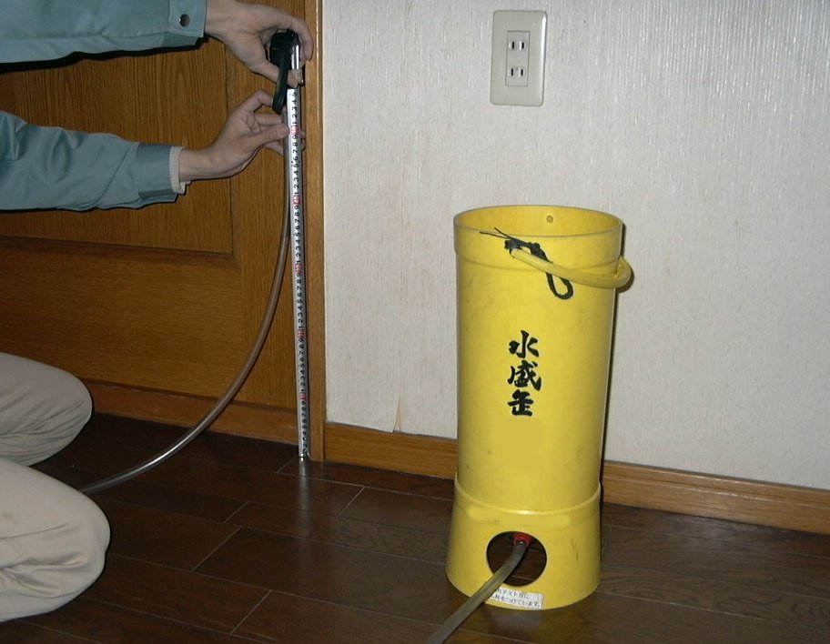 レベルと水盛管を併用するのが理想的ですが、どちらか一方を行う場合では水盛管による測定を行いましょう。
